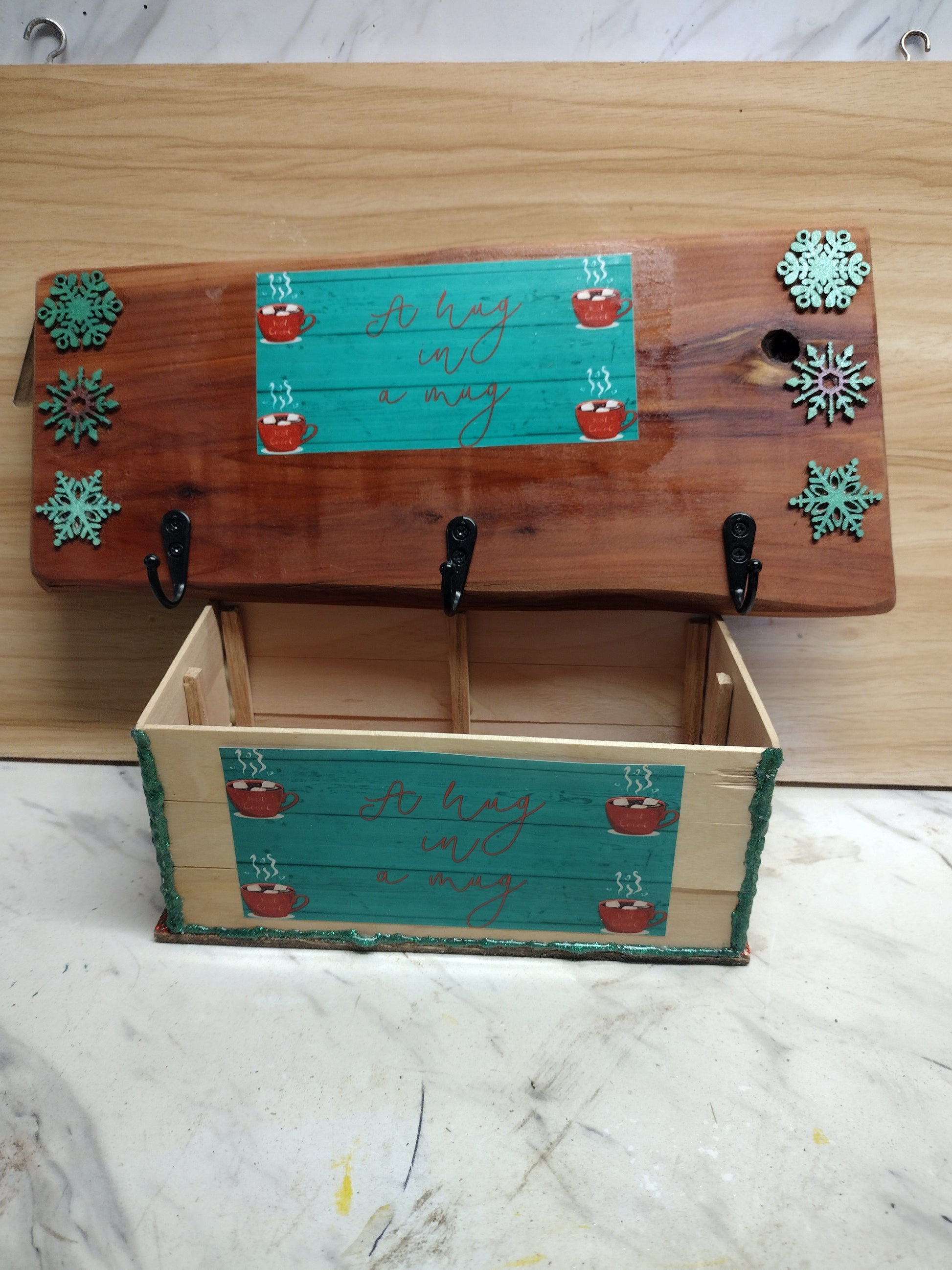 This handcrafted wooden Hug in a Mug Organizer Set is perfect for cozying up your kitchen or coffee bar this winter. Designed with a mug holder and a separate pod or bag holder, it keeps your favorite hot chocolate, coffee, or tea essentials neatly organized. Featuring the warm "hug in a mug" quote, it adds charming festive spirit to your holiday decor. Each set varies slightly, making yours truly unique while bringing both style and function to your hot chocolate or coffee station.