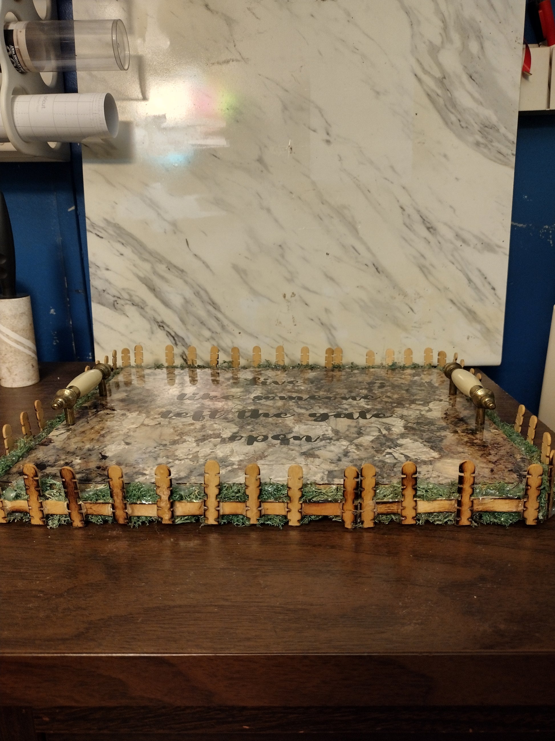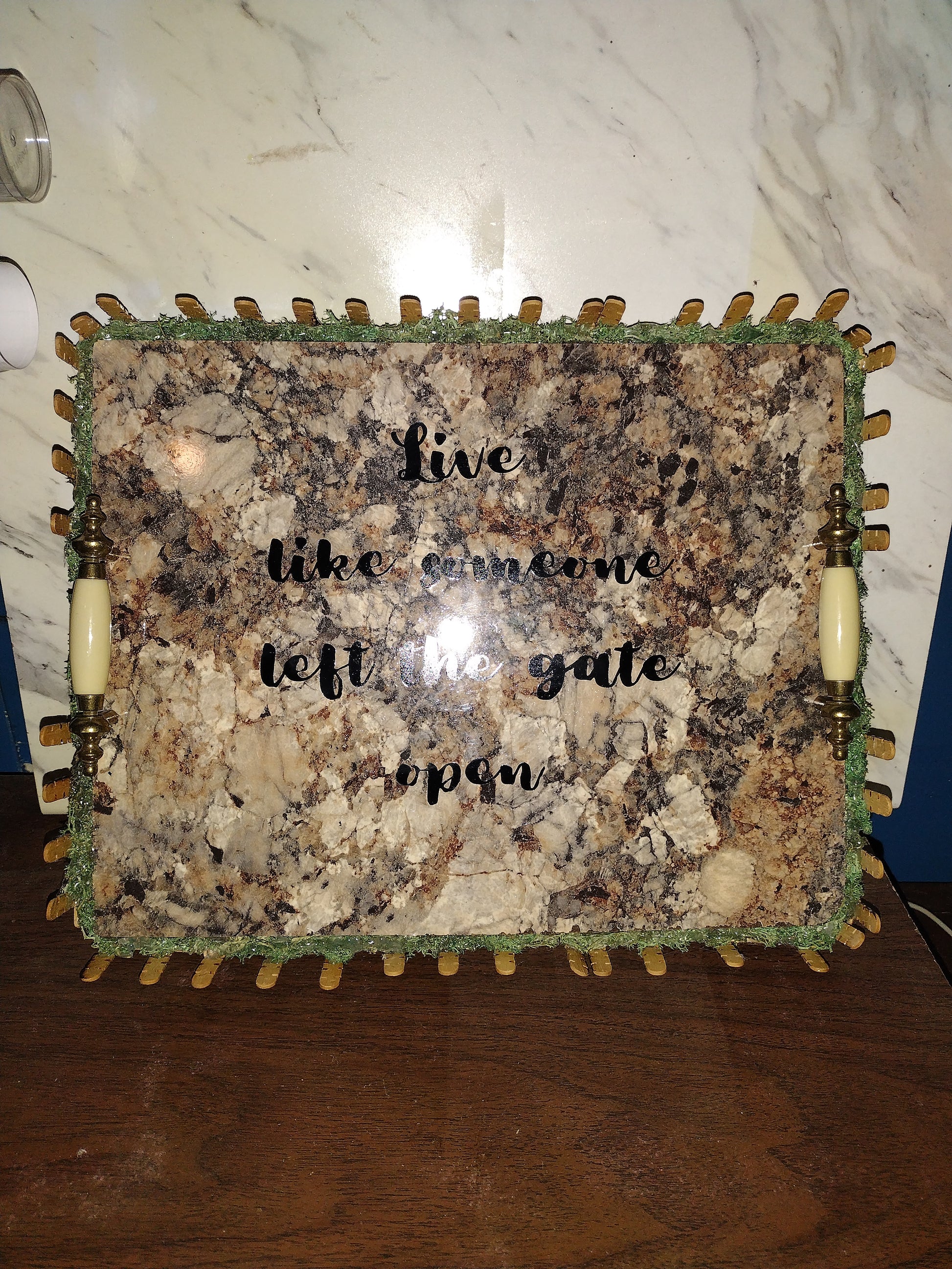 Live like a hosting pro with this handcrafted serving tray. Its vinyl decal features the playful phrase, "Live like someone left the gate open," perfect for parties or coffee with loved ones. A charming pasture design lines the edges. Slight differences may occur due to handcrafting.