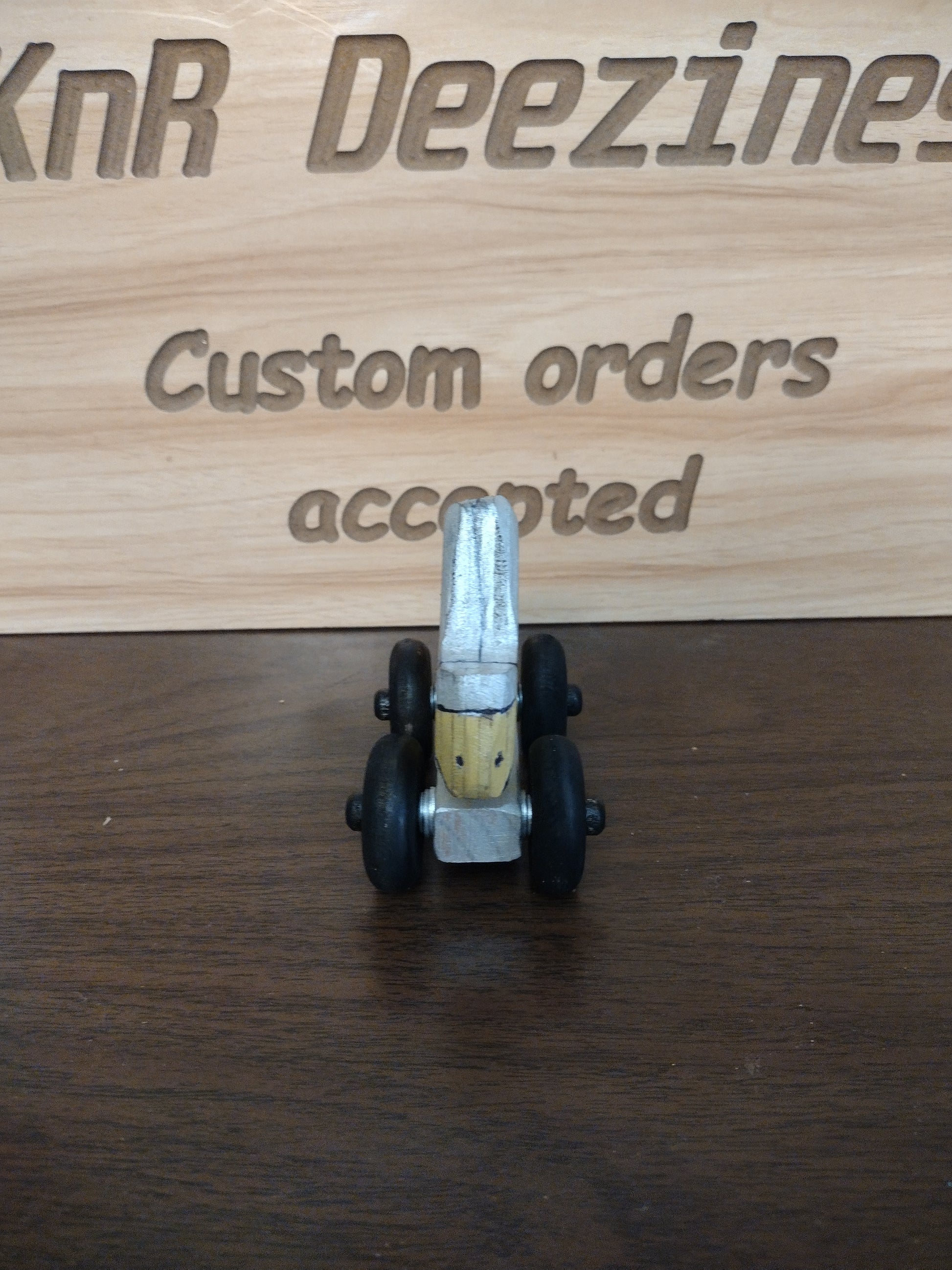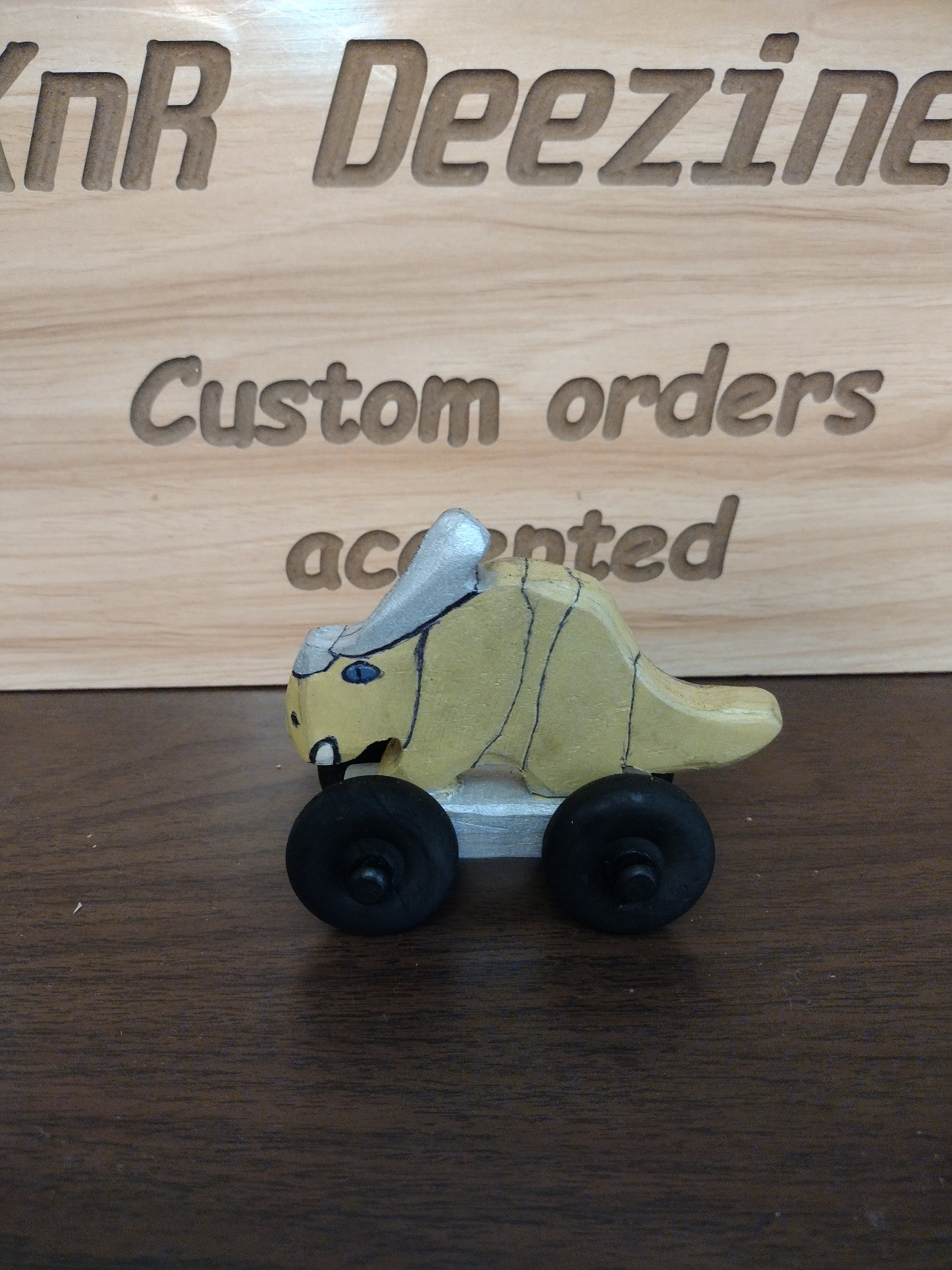 Rev up your child's imagination with this one-of-a-kind wooden car, handcrafted in the shape of a playful Triceratops! (Note: slight differences and color variations may occur due to its handmade nature). Perfect for kids who love cars and dinosaurs.