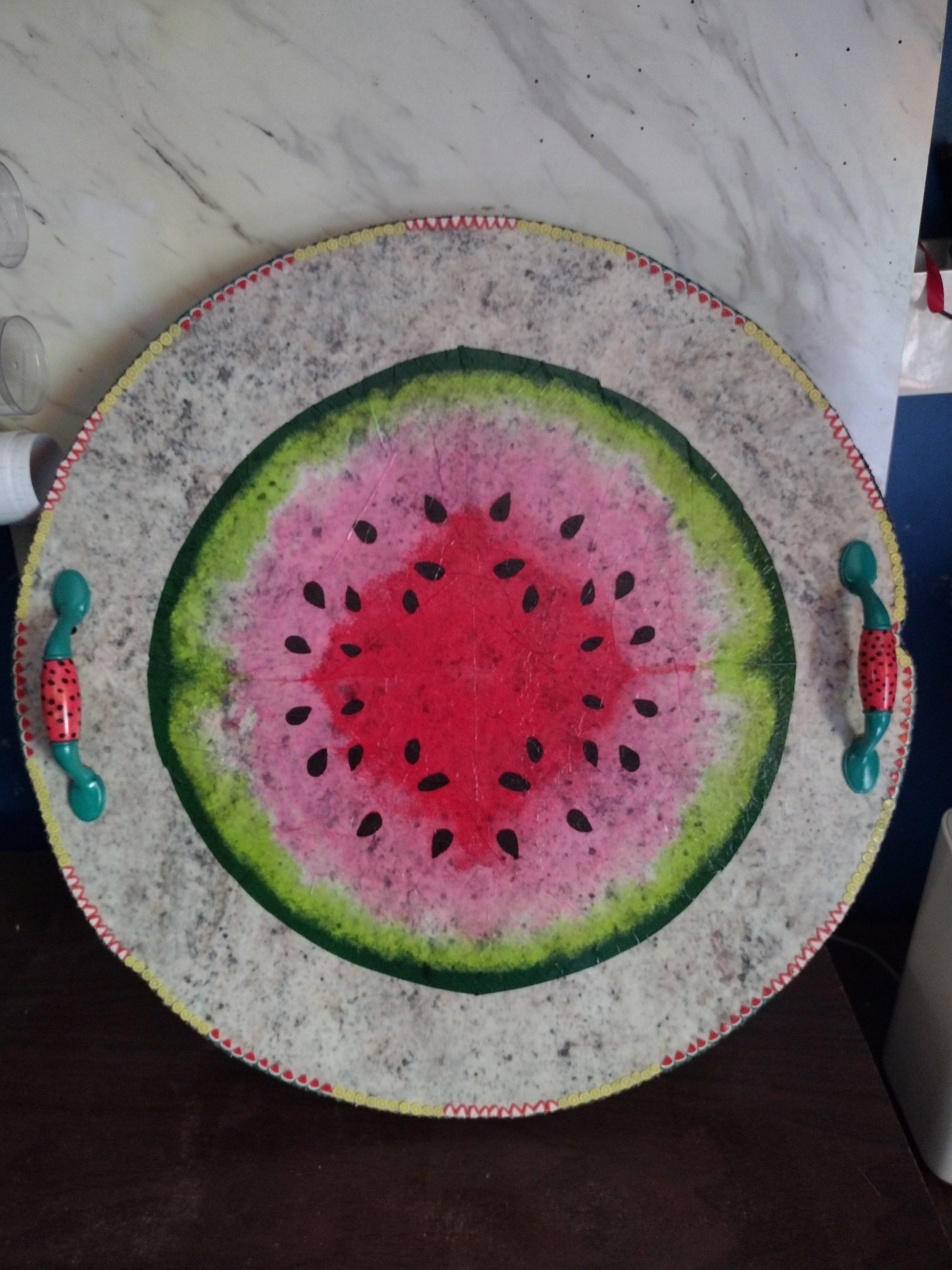 Experience the fresh and vibrant summertime vibes with our handcrafted Watermelon Serving Tray! Perfect for parties and gatherings, this serving tray features a fun watermelon design that is sure to make a statement. Enjoy your favorite snacks and drinks in style with this unique and eye-catching tray. Slight differences may occur due to the handcrafted nature.